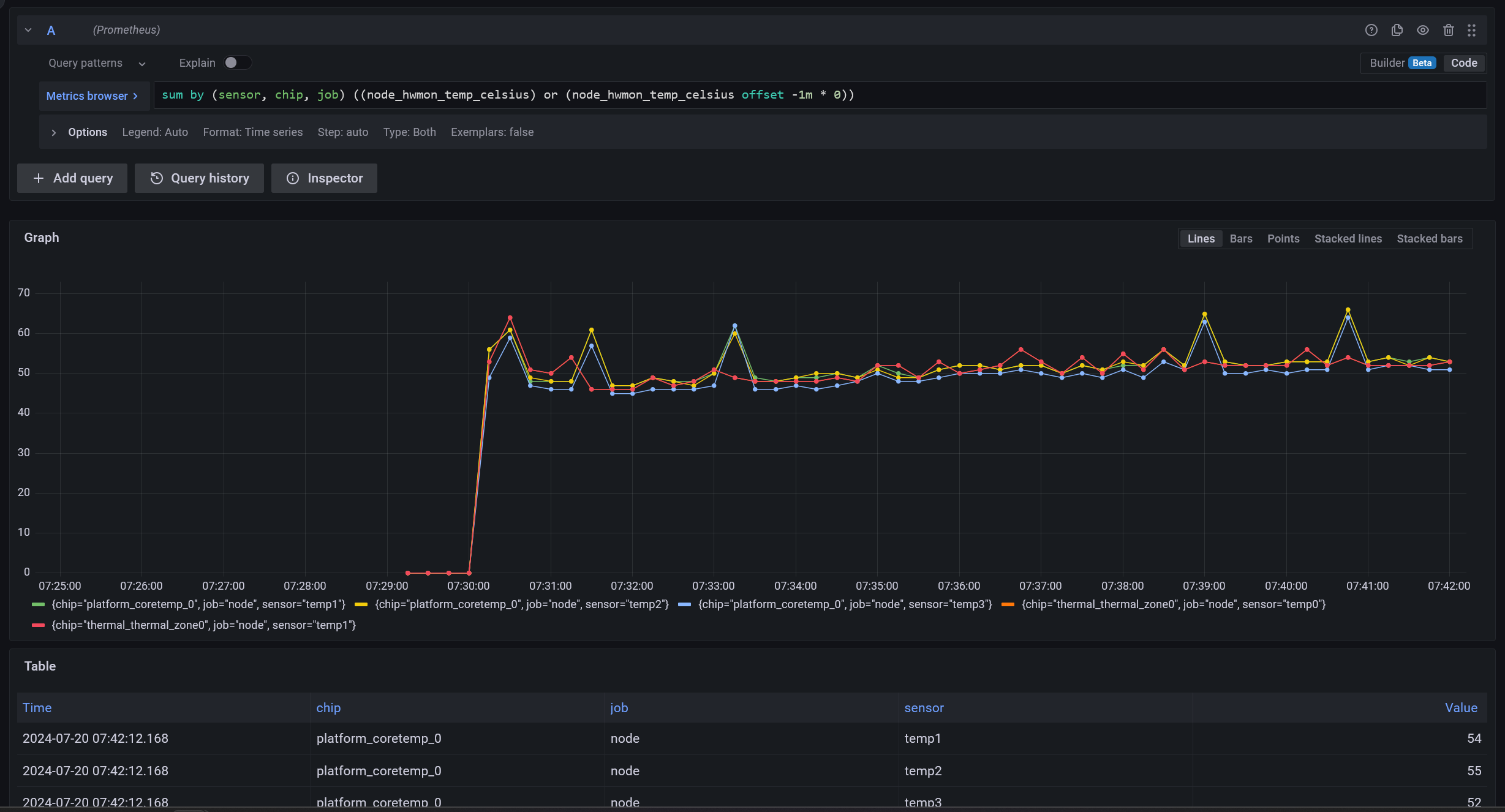 | The query showing my CPU temp, with a filter to show only 1 time series |