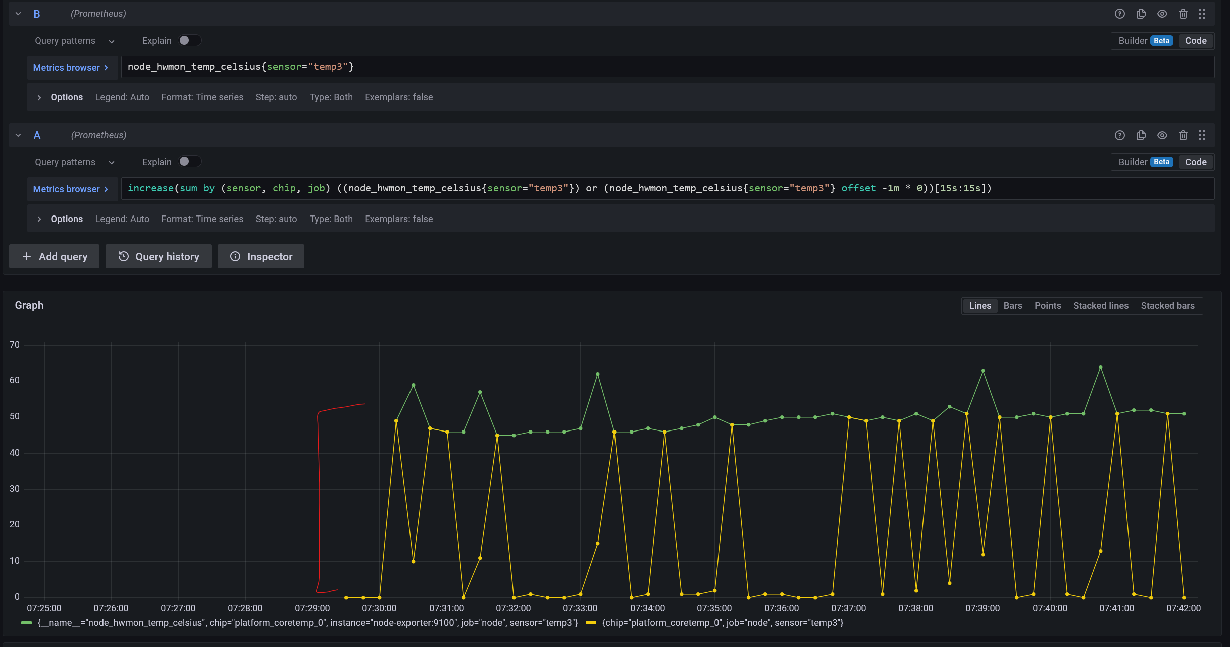 node_hwmon_temp_celsius{sensor="temp3"} or node_hwmon_temp_celsius{sensor="temp3"} offset -1m * 0